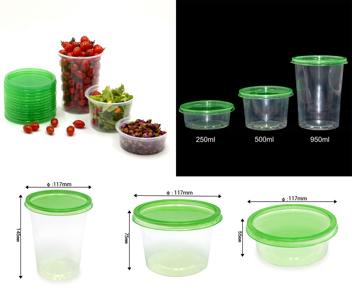 Dimensión | 250ml: Φ:117mm Alto:55mm 500ml: Φ:117mm Alto:75mm 950ml: Φ:117mm Alto:145mm Tapa: Φ:117 mm Alto: 5 mm |