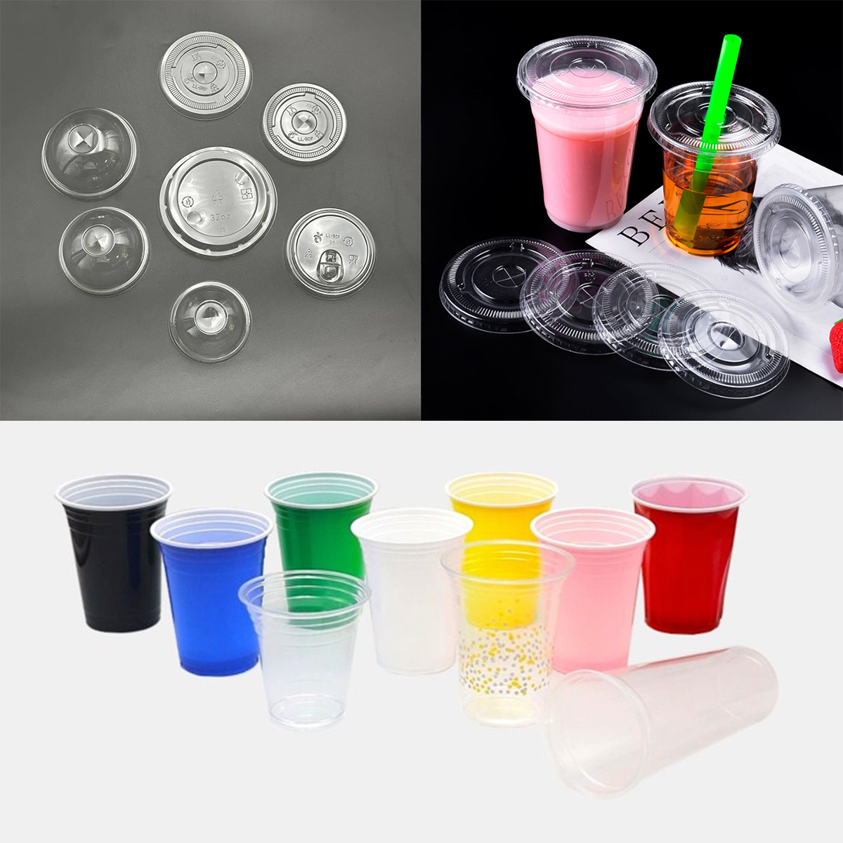 Diseño: También ofrecemos tapa con bisagras con 3 diseños diferentes: plana y abovedada con orificios para pajita o patrón para beber a sorbos.